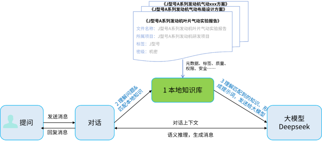 通過自然語言處理技術(shù),對(duì)用戶問題進(jìn)行語義分析,提取關(guān)鍵信息,然后與本地知識(shí)庫中的數(shù)據(jù)進(jìn)行匹配,找到與問題最相關(guān)的文件或文檔片段(如系統(tǒng)會(huì)查詢J型號(hào)相關(guān)文件中與葉片進(jìn)氣參數(shù)設(shè)計(jì)值相關(guān)的內(nèi)容。通過匹配算法,確定與問題最相關(guān)的文檔或文檔片段)。