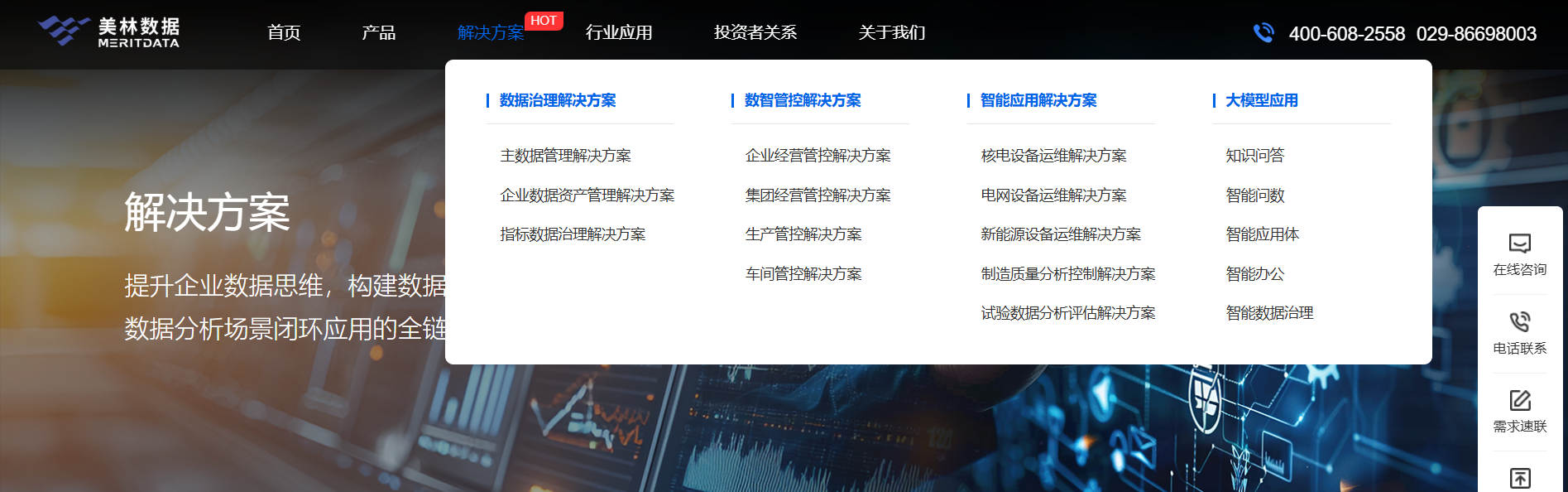解決方案頁以“數(shù)據(jù)治理-數(shù)智管控-智能應(yīng)用-大模型創(chuàng)新”為邏輯主線,形成公司