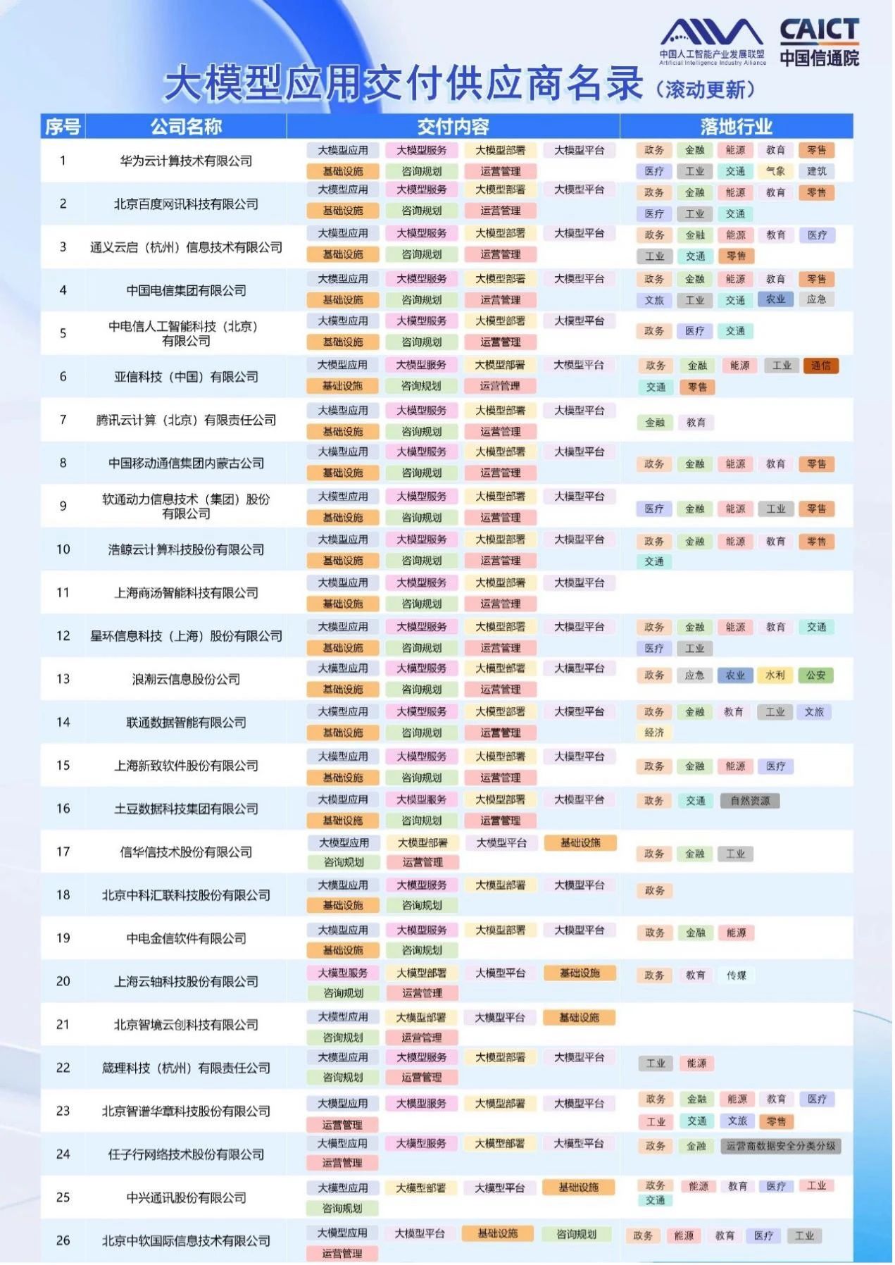 美林?jǐn)?shù)據(jù)入選由中國信通院與中國人工智能產(chǎn)業(yè)發(fā)展聯(lián)盟聯(lián)合發(fā)布的《大模型應(yīng)用交付供應(yīng)商名錄》。美林?jǐn)?shù)據(jù)大模型交付能力涵蓋大模型應(yīng)用、大模型部署、大模型咨詢規(guī)劃、大模型運營管理4大方向;大模型落地行業(yè)聚焦能源、工業(yè)、教育3大領(lǐng)域。