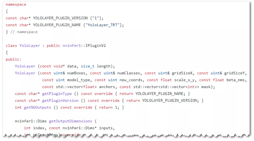 由于第一階段采用的檢測(cè)模型為Yolov4-tiny,而TensorRT中對(duì)其中的一些層的算子不支持,要生成優(yōu)化模型,需要結(jié)合DeepStream部署框架及TensorRT相關(guān)標(biāo)準(zhǔn),實(shí)現(xiàn)對(duì)應(yīng)IPluginV2和IPluginCreator的接口: