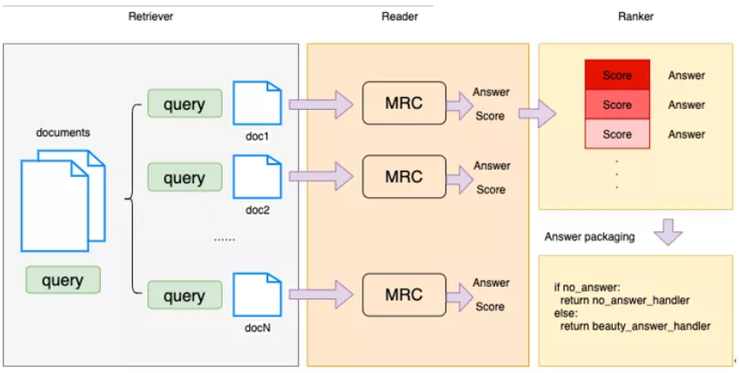 綜上,一個Document QA模型的整體架構(gòu)可以分為三層:文檔提取(Retriever)、答案提?。≧eader)、答案排序(Ranker)。