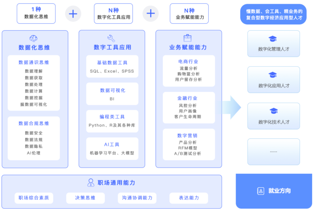 02培養(yǎng)目標(biāo) 美林?jǐn)?shù)據(jù)旨在培養(yǎng)具備扎實(shí)的經(jīng)濟(jì)學(xué)知識(shí)、管理學(xué)基礎(chǔ),具有數(shù)據(jù)思維,又能熟練運(yùn)用現(xiàn)代數(shù)字化工具技術(shù),掌握數(shù)字資源處理方法,熟悉我國數(shù)字經(jīng)濟(jì)運(yùn)行規(guī)律與改革實(shí)踐,能夠勝任政府機(jī)構(gòu)及企事業(yè)單位數(shù)字經(jīng)濟(jì)工作,適應(yīng)地方經(jīng)濟(jì)建設(shè)和社會(huì)發(fā)展的高素質(zhì)復(fù)合型應(yīng)用人才。緊密結(jié)合市場需求,注重學(xué)生綜合素質(zhì)和實(shí)踐能力的培養(yǎng),確保畢業(yè)生能夠在數(shù)字經(jīng)濟(jì)領(lǐng)域迅速適應(yīng)并發(fā)揮重要作用。