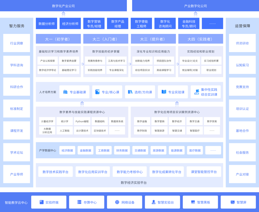 從教學(xué)資源、實(shí)踐方式著手,注重真實(shí)的產(chǎn)業(yè)實(shí)戰(zhàn)應(yīng)用能力培養(yǎng),搭建數(shù)字經(jīng)濟(jì)實(shí)踐教學(xué)基礎(chǔ)環(huán)境和數(shù)字經(jīng)濟(jì)應(yīng)用能力成長平臺(tái)基座,服務(wù)于專業(yè)通識(shí)/基礎(chǔ)課程、專業(yè)/核心課程、選修/方向課程、專業(yè)實(shí)驗(yàn)課、集中實(shí)踐/綜合實(shí)訓(xùn)課的實(shí)踐教學(xué)與應(yīng)用實(shí)訓(xùn),強(qiáng)化師生數(shù)字化技術(shù)工具應(yīng)用和創(chuàng)新能力。